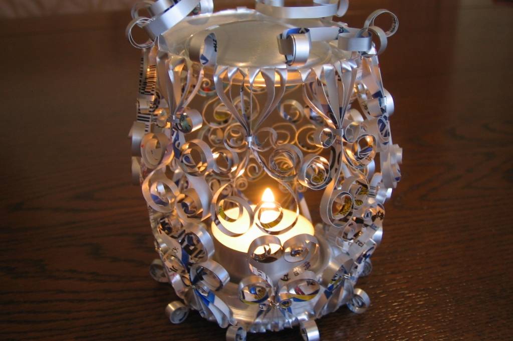 Красить жестяную банку лучше акриловой краской, затем покрывая лаком. По бокам можно сделать дырочки, куда продевают и закрепляют проволочную ручку. Подсвечники из консервных банок декорируют искусственными цветами, лентами, росписью, оклеивают камушками, мозаикой из старой керамики (битых чашек, тарелок), расписывают глиттером в марокканском стиле, нарезают полосками и создают удивительные кружевные шедевры, как на фото ниже.