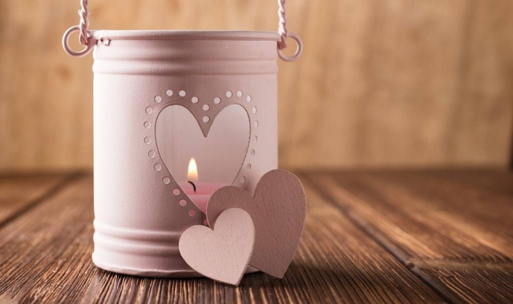Следующий светильник из жестяных банок делается почти таким же образом. Такой подойдёт для подарка любимому человеку. Нарисуйте очертания сердечка и при помощи гвоздя и молотка сделайте его более видимым. Внутрь также поставьте ароматическую свечу.