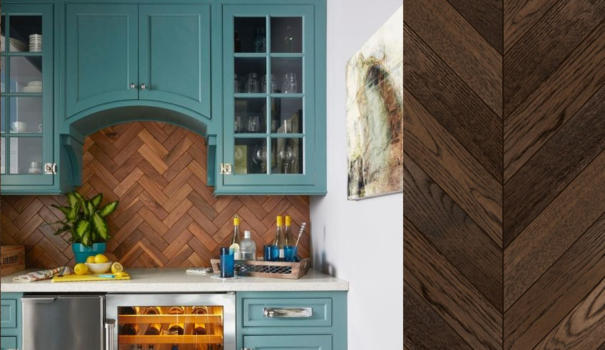 Спорное, но эффектное решение — выложить паркетом кухонный фартук. Возле варочной поверхности на помощь капризному паркету, не готовому к перепаду температур, придёт экран из закаленного стекла.