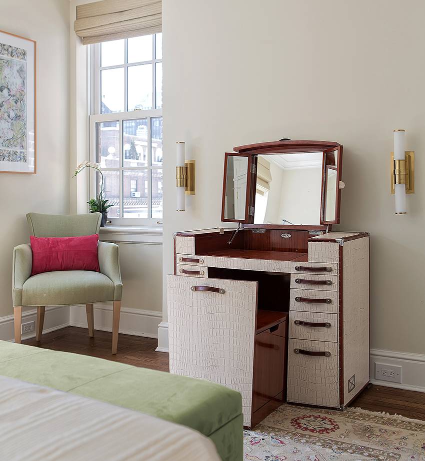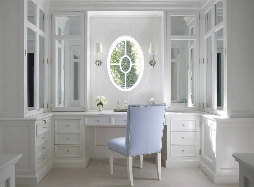 Заранее продумайте, что будет храниться на полках, в ящиках и тумбочке под туалетным столиком или в подвесных шкафах. Разделите предметы на 2 категории: первой необходимости и то, что можно задвинуть под стенку. Всегда прибавляйте к планируемой площади хранения 20%. Впоследствии они очень пригодятся. Шкафчики для хранения можно подвесить над столиком по обе стороны от зеркала. А можно использовать знакомый по американским фильмам вариант, когда зеркало вешают на дверцу маленького шкафчика.