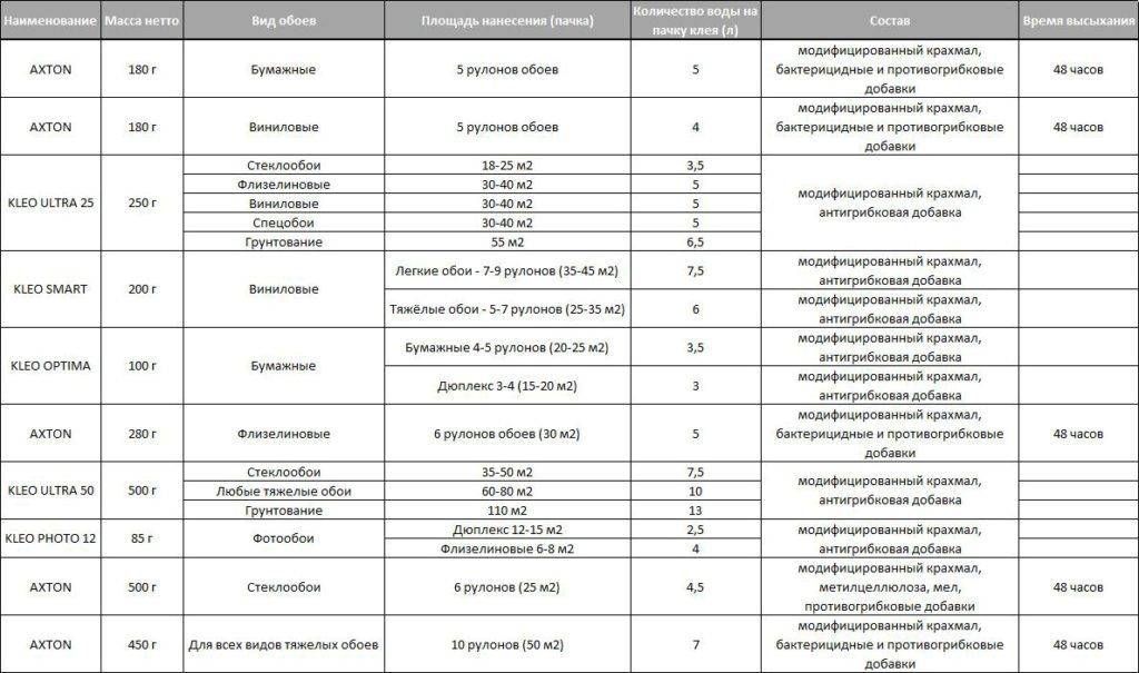 Пример заявленных основных связующих веществ и добавок в клеящих составах для различных видов обоев приведены в таблице: