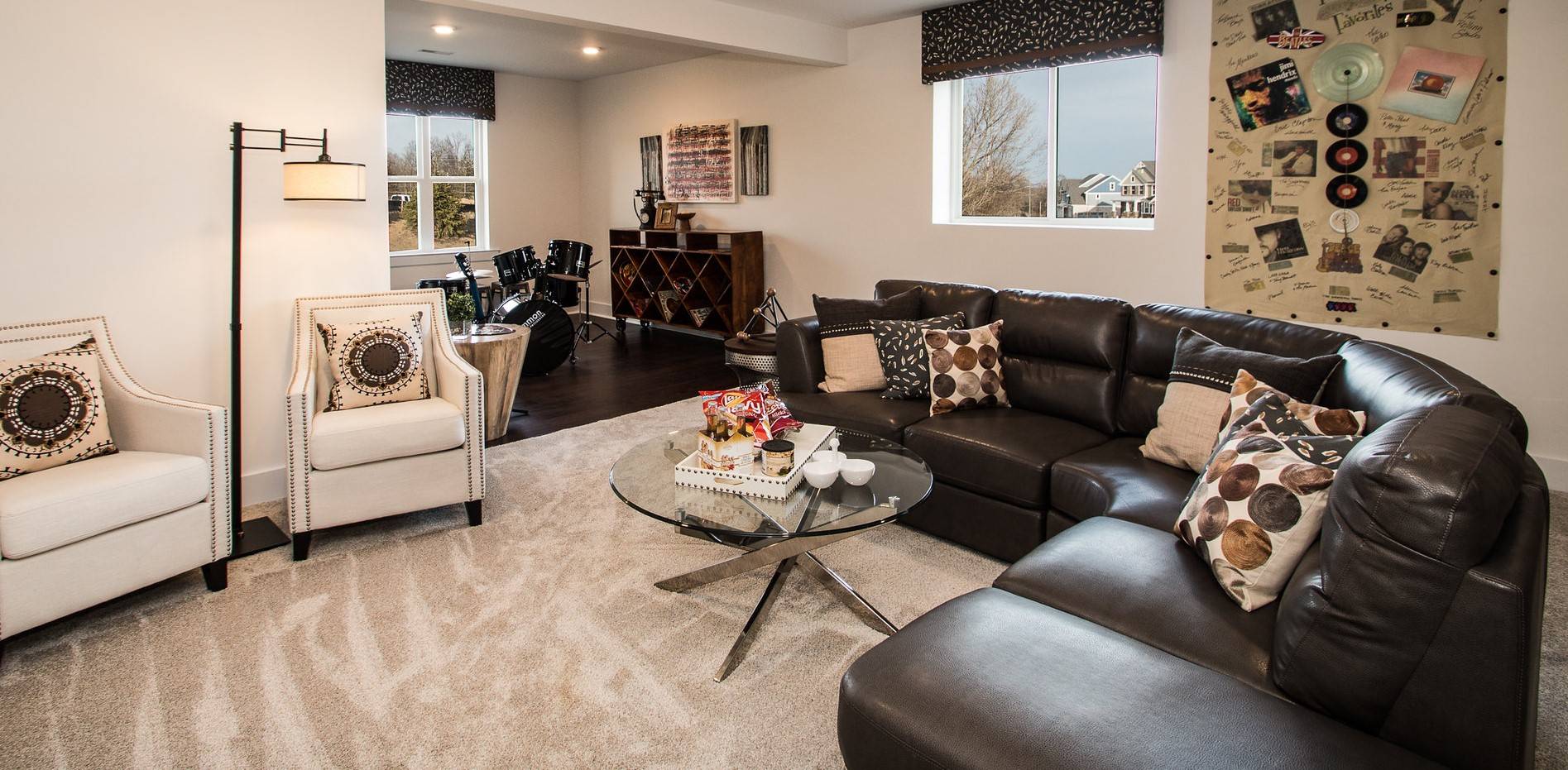 Для контраста возле черного дивана можно разместить пару светло-бежевых кресел