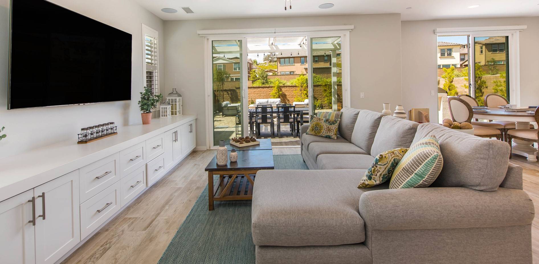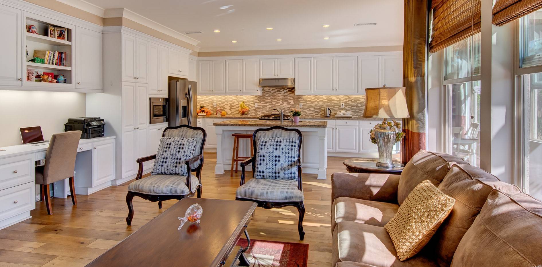 Светло-бежевых диван идеально сочетается с общим интерьером кухни-гостиной