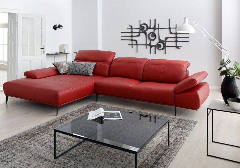 Угловой диван может стать ярким акцентом, например, красная модель в бело-серой комнате.