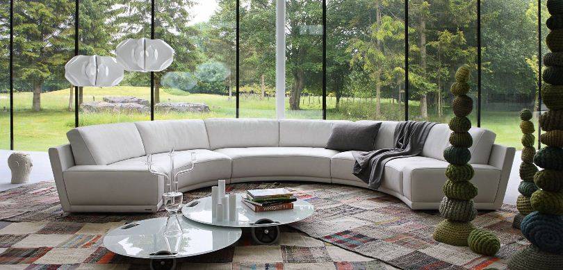 - Полукруг. Напоминает П-образные модели, но прямые углы заменены округлыми сгибами. Спать на таком диване не всегда удобно, а вот собираться большой компанией – очень. Обычно полукруглые диваны выбирают для комнат с тщательно проработанным интерьером, где важна каждая деталь.