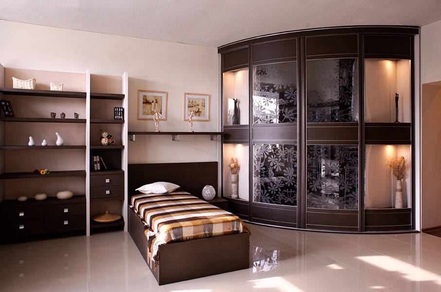 Угловой шкаф с кроватью. В таком варианте кровать может встраиваться в элементы шкафа, образуя второй этаж сверху, или же устанавливаться сбоку. Все оставшееся пространство под спальным местом должно использоваться для шкафчиков, полочек или ящиков.