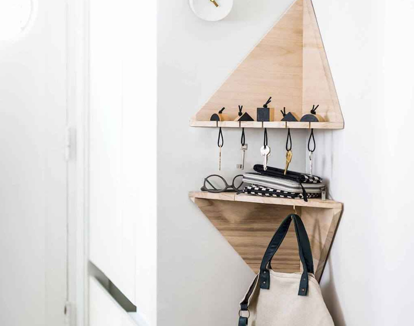 Сделать своими руками угловую полку проще простого. Для изготовления одной полочки как на фото ниже вырежьте треугольную заготовку желаемого размера и с необходимым углом (редко внутренние углы стен составляют ровно 90 градусов) из фанеры или дерева толщиной 1,5-2,5 см, а также две небольшие планки-опоры (длина одной планки должна соответствовать катету треугольной заготовки, а длина второй планки должна рассчитываться по формуле: длина катета минус ширина первой планки).