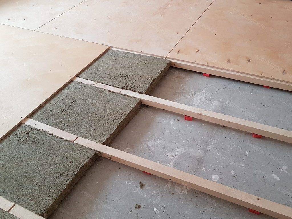 Проще всего организовать звукоизоляцию полов по лагам. Между деревянными брусками укладываются пористые минераловатные плиты, засыпается керамзит, либо вспученный вермикулит.