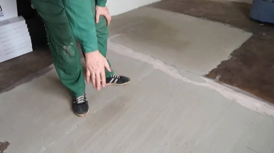 Когда поверхность полностью залито и выравнено, помещение оставляется сохнуть. После высыхания, когда уже можно свободно наступать на пол, прикладывается правило и, в местах нехватки добавляется раствор, разглаживается шпателем.