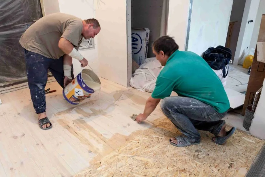 Метод эффективный, но затратный по времени. В продаже есть множество специальных смесей, позволяющих фактически своими руками подготовить деревянный пол или покрытие из фанеры, чтобы затем правильно и ровно положить ламинат. Технология их нанесения следующая: