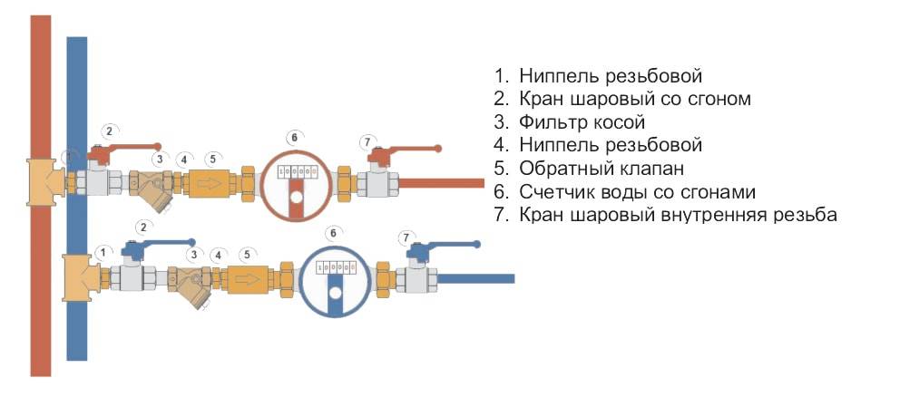 Схема установки водяного счетчика с запорными кранами с двух сторон
