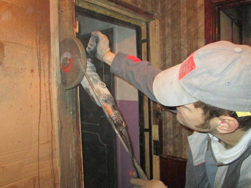 В старом кирпичном здании выполнять работы по демонтажу следует осторожно, чтобы не повредить сильно кладку; то же касается и стен из пенобетона. Полотно двери снимают с петель, а затем болгаркой или ножовкой лутка надрезается в двух-трех местах