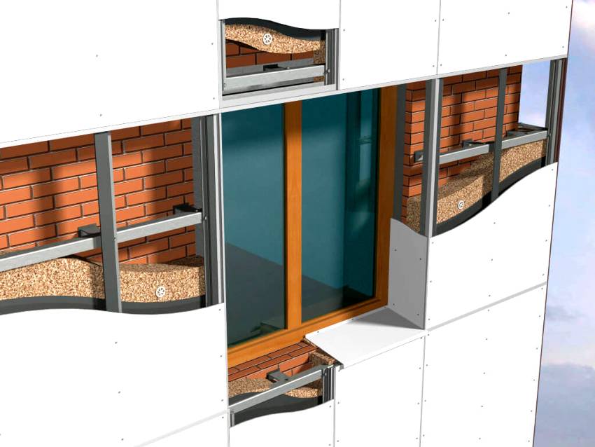 Наиболее востребованной фасадной системой утепления считается навесной вентфасад, суть которого заключается в наличии сквозной воздушной прослойки между фасадом и утеплителем. Вентилируемая прослойка предотвращает проникновение влаги, а также воздушные потоки в навесном каркасе хорошо охлаждают стену в жаркий период года, даже при прямом попадании солнечных лучей.