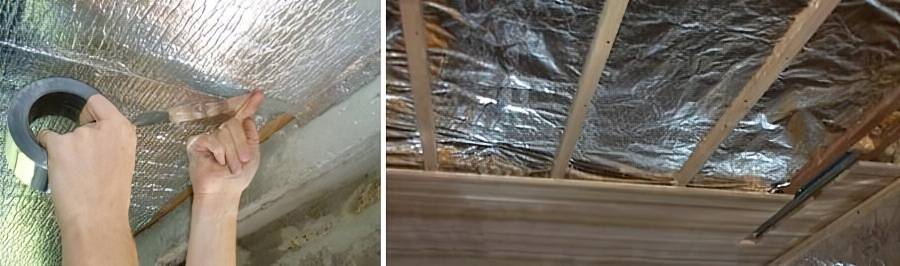 - С помощью тонких деревянных реек прикрепляем к имеющейся подшивке потолка подвала пароизоляционную пленку, делая перехлест полотна в сто миллиметров.