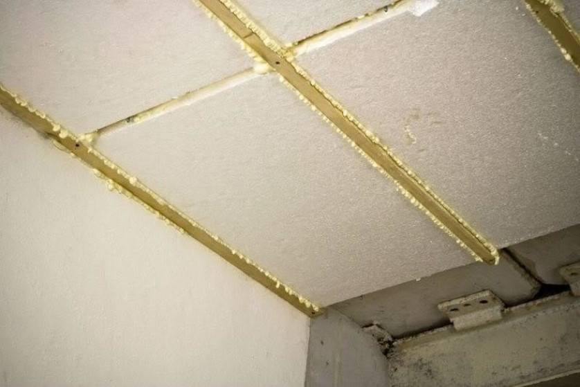 - Пенополистирол – практичен для бетонного перекрытия. Укладывается в обрешетку с заглублением около 3 см и закрывается отделочным материалом (вагонка, гипсокартон, Армстронг, натяжной потолок).
