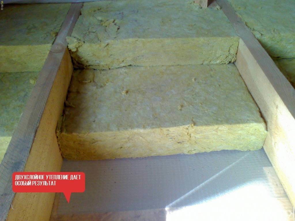 - Далее укладывается сам утеплитель в 1 — 2 слоя, толщиной минимум 20 см. Обязательно учитываем, что размер теплоплит должен совпадать с покрываемой площадью.