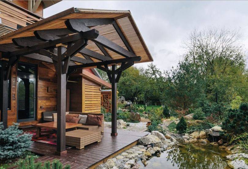 И в продолжение темы. Как было сказано выше, расположение веранды еще во многом зависит от вида, который открывается с этой пристройки. А если он ограничен забором соседа, то вид можно организовать за счет ландшафтного дизайна собственного участка. Конечно, если есть для этого место.