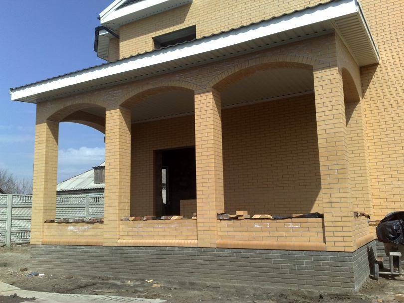 - конструкция может быть сплошной – с полноценными стенами, воспринимающими нагрузку от крыши – или с колонновидными опорами. Второй вариант более экономичен в плане затрат материалов и времени. Колонны с 4 кирпичами или более в ряду кладки устраиваются обязательно по углам веранды и, при большой ее площади, дополнительно в промежутках. На фото выше показан именно такой вариант, с колоннами, пространство между которыми заполнено частично металлопластиковыми окнами, частично – однорядной кирпичной кладкой;