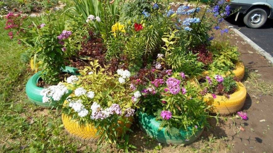 Еще можно разукрасить автомобильные покрышки и сложить их в шахматном порядке, заполнить почвой, а затем посадить подходящие растения. Получится также цветущая пирамида, но немного другой формы. Подробнее про клумбы из покрышек читайте тут.