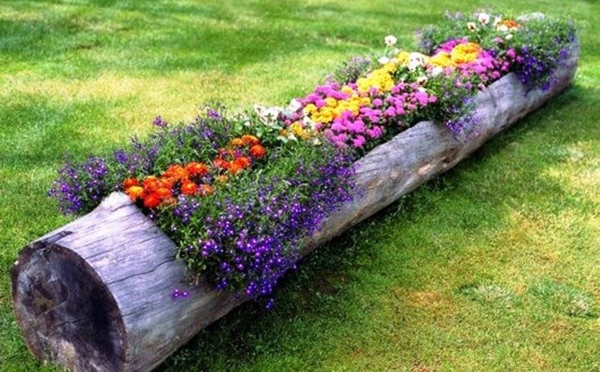 Красивые композиции создают ландшафтные дизайнеры из простого обрезка толстого ствола дерева, уложенного на бок. У каждого есть возможность попробовать воссоздать изящный цветник самостоятельно.