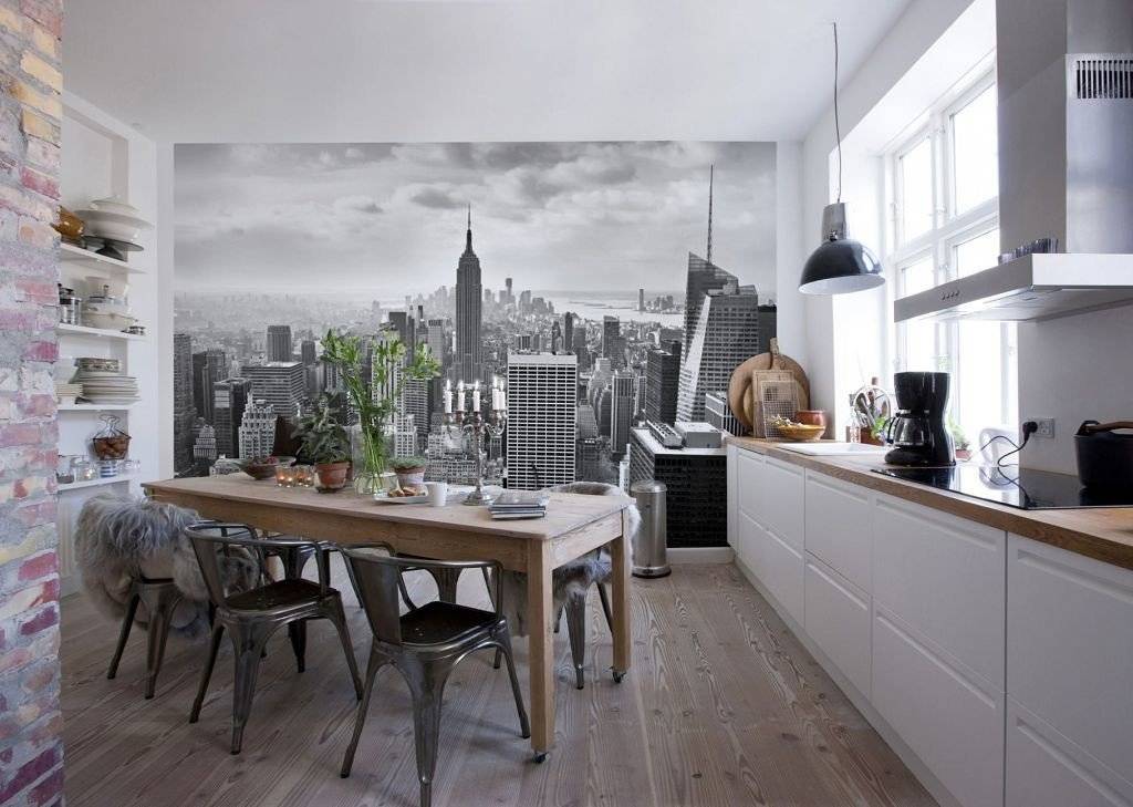 Часто фотообои используются в просторных кухнях-гостиных для зонирования пространства, создавая необычные визуальные эффекты. Но это не значит, что их нельзя использовать и на маленьких кухнях