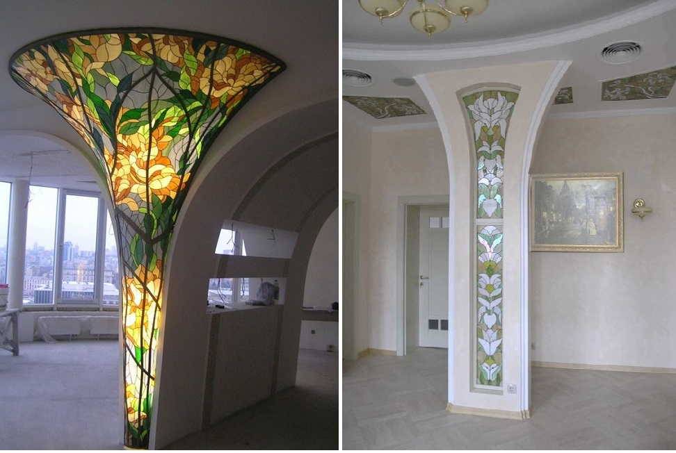 Витражная полуколонна с подсветкой. С тем же орнаментом элементы на потолке кухни