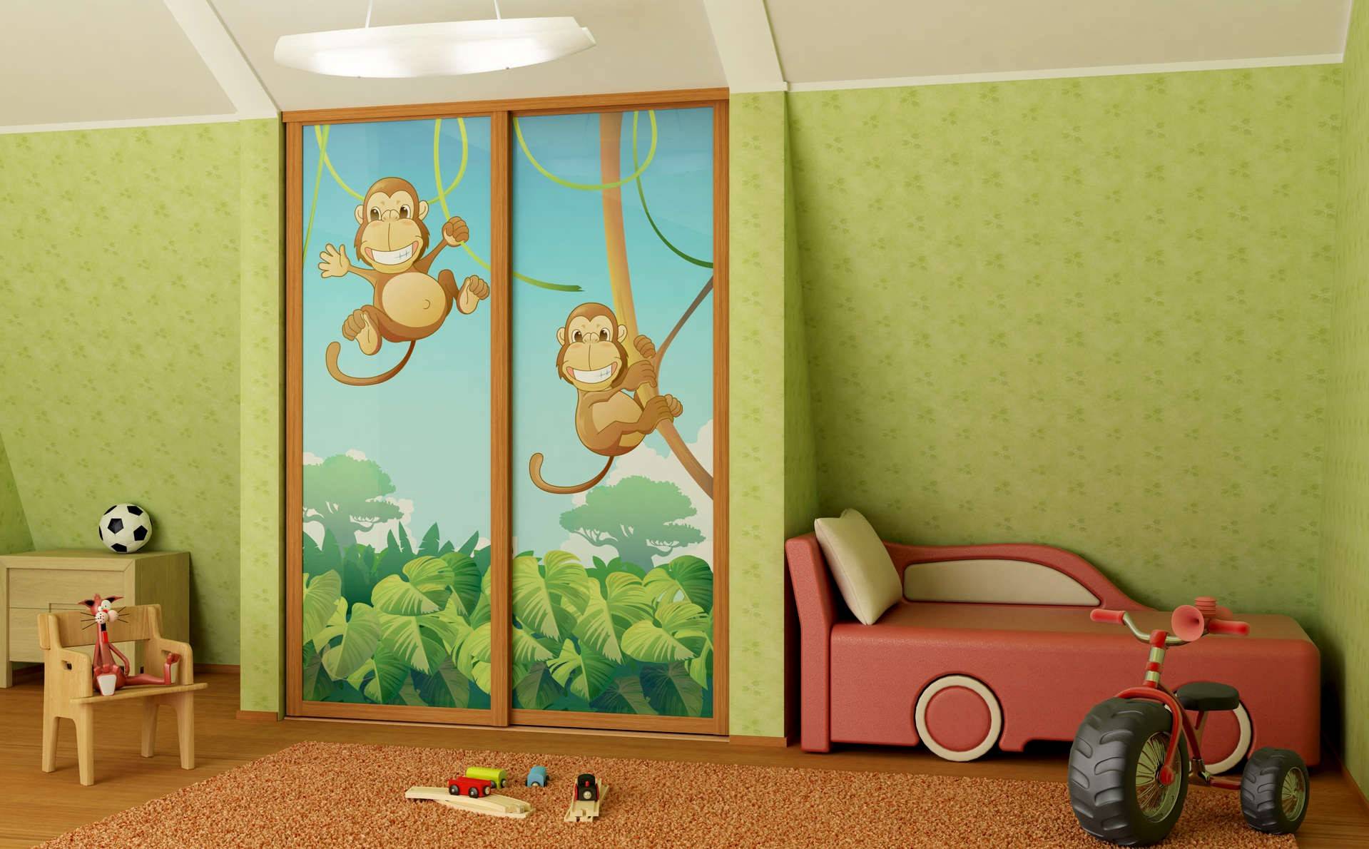 Самым распространенным и привлекательным для ребенка может быть витраж, выполненный в виде фотопечати и пленочного изображения: ведь в качестве рисунка может быть любимый сказочный герой. Обычно они наносятся на стеклянную поверхность, в данном случае на стекло двери детской комнаты.