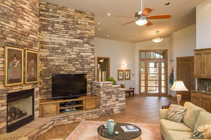 Декоративный камень и интерьерный кирпич идеально сочетается со всевозможными вариантами организации фонтанов или аквариумов, а также мест озеленения, то есть насаждения комнатными растениями. Особенно это касается вьющихся растений. Отлично подойдет декоративный камень для выделения каминов, оконных и дверных проемов. Формирование цельных структур имитирующих большие глыбы и валуны возможно, если произвести отделку под камень заранее сформированного каркаса из гипсокартона. Такие варианты, правда, можно оформить разве что только в достаточно обширных помещениях.