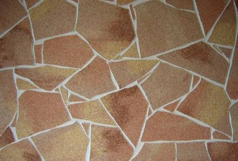 Гипсовой шпаклевкой аккуратно заполняются все промежутки между отдельными фрагментами покрытия. Излишки следует моментально вытирать до засыхания смеси. Поскольку застывшая шпаклевка по цвету не соответствует искусственному камню, полной гармонии достигают нанесением на швы специального пигмента подходящей окраски.