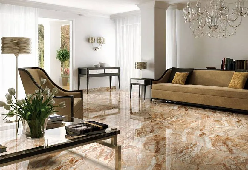 Напольная плитка в интерьере гостинойИсточник 3dplitka.ru