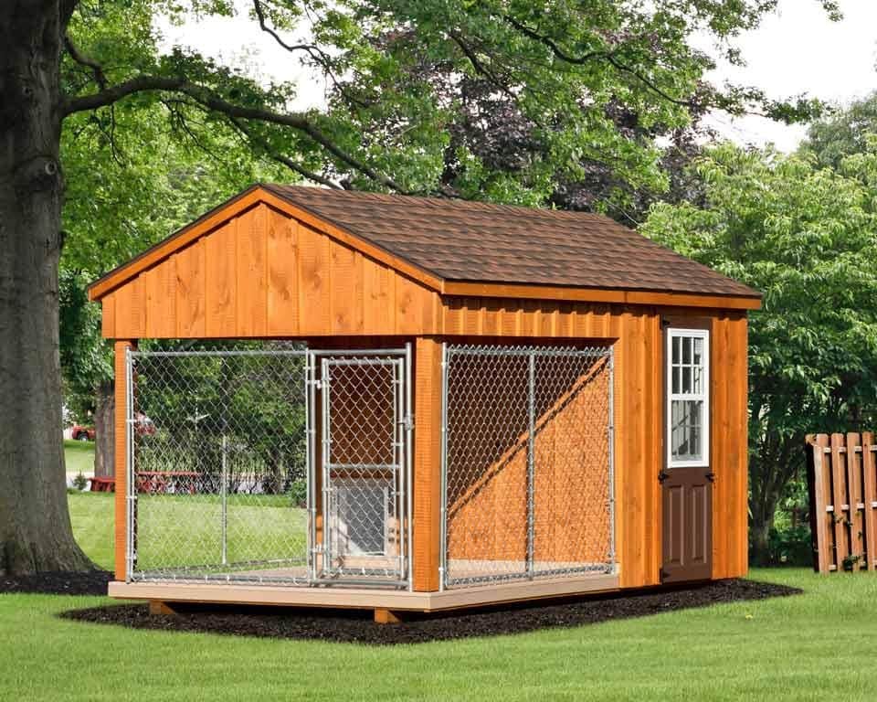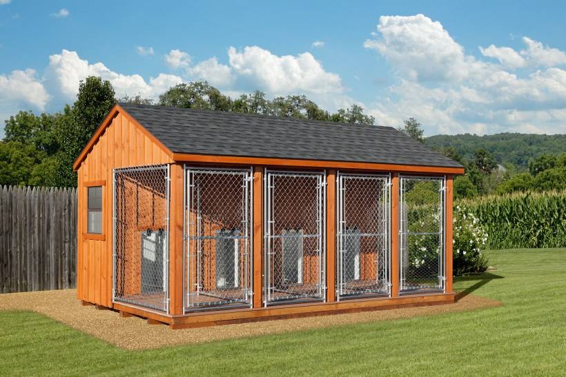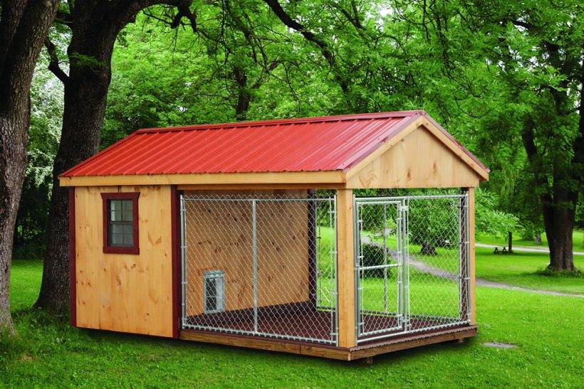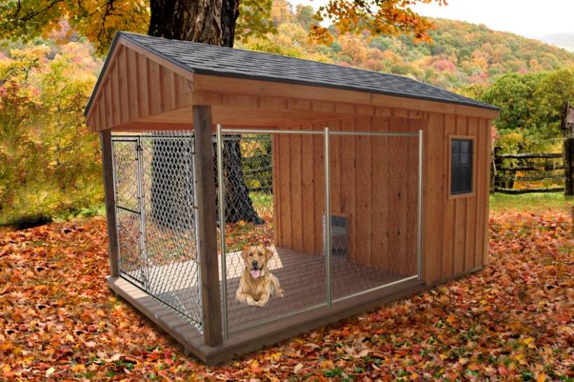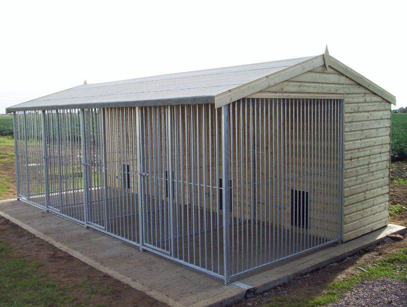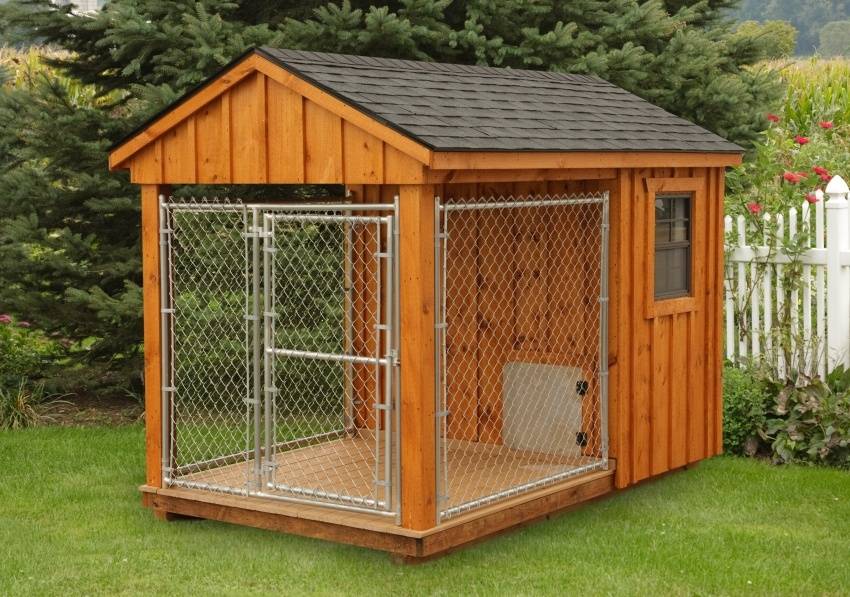 - Самым подходящим и наиболее распространённым считается деревянный вольер с металлической сеткой. Такое строение подходит для содержания собак любого размера и породы. При этом две или три его стороны должны быть сплошными для защиты от ветра, а остальные делаются из сетки.