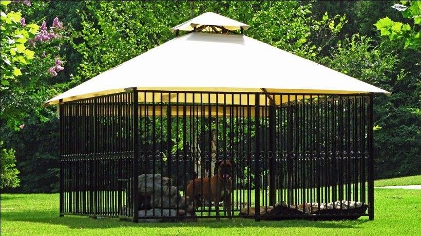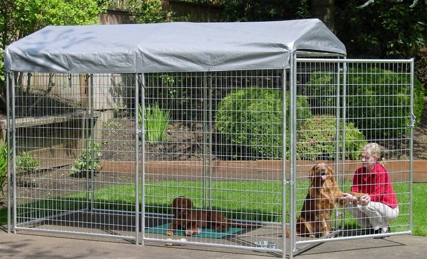 В открытых вольерах содержат густопсовые (с шерстью по всему телу, голове и конечностям) породы: овчарок, русскую сторожевую и т.п. И в регионах с более-менее мягким климатом такой вольер — это обычная загородка. В климате умеренном потребуется еще и будка в качестве убежища от холода и непогоды. А для собак, выезжающих с владельцами на дачу, можно просто соорудить над складным вольером (чтобы не потерялись, вырвавшись на долгожданную свободу) тент от солнца и дождя.