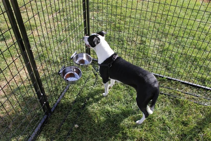 - Хорошо, если на стенках вольера будут предусмотрены крепежи для миски с водой и едой. Если собаке придется оставаться в клетке одной на долгое время, то это будет очень кстати.