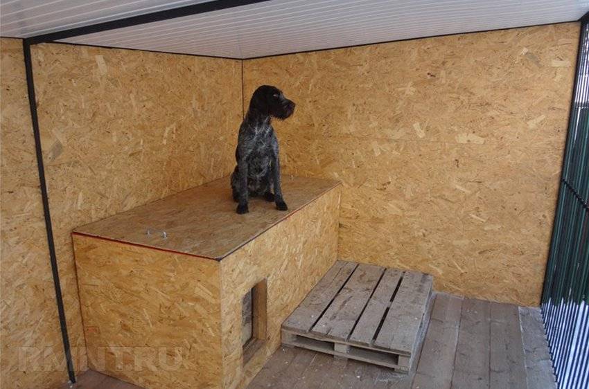Чтобы питомец не мёрз в холодное время на бетонном полу, нужно сбить дощатый помост. На нём должна умещаться конура, плюс желательно оставить по 1–1,5 метра пространства с каждой стороны. На случай сильных заморозков лучше сбить полку, расположенную в метре над землёй. Какие либо ухищрения с общим утеплением площадки под вольером, по сути, бесполезны: покрытие всё равно будет находиться при уличной температуре, поэтому небольшого дощатого настила будет вполне достаточно. Единственный момент — его нужно сбивать на достаточно высоких брусках, чтобы изолировать от влажности на полу и оставить продух для проветривания.