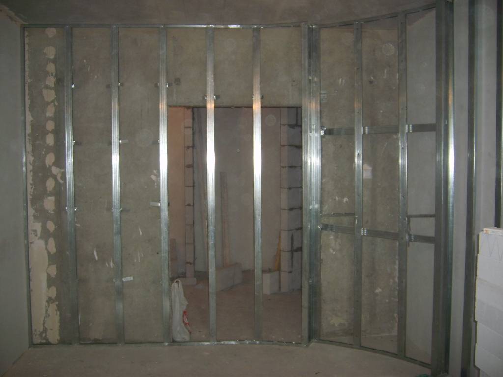 Этот способ незаменим в том случае, если стену нужно утеплить или создать шумопоглощающий заслон. Каркас под гипсокартон может быть изготовлен из деревянных брусков или металлических оцинкованный профилей.