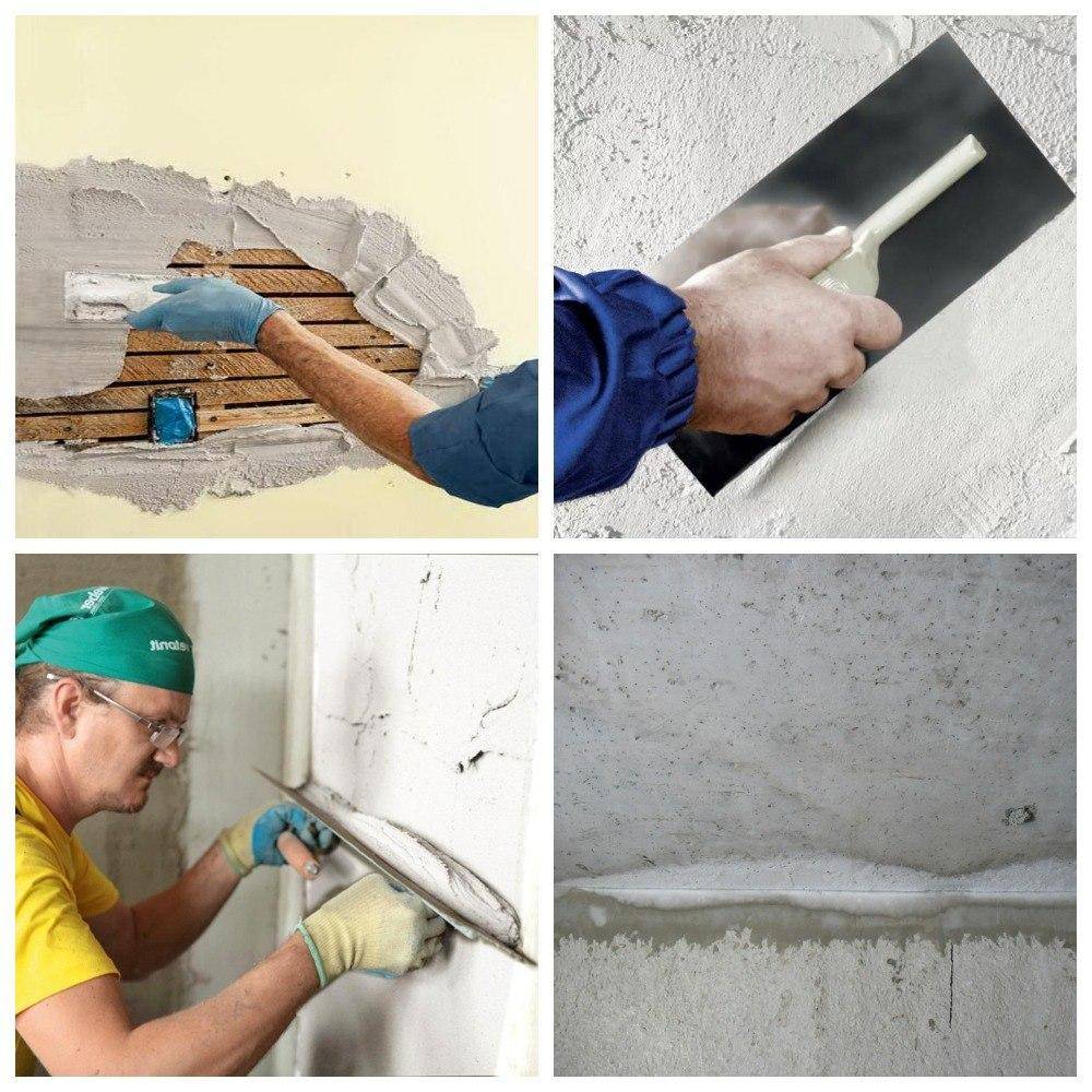 - Значительные выступы следует в обязательном порядке сбить, так как при их наличии потребуется затратить больше штукатурки, а также необходимо выполнить заделывание трещин.