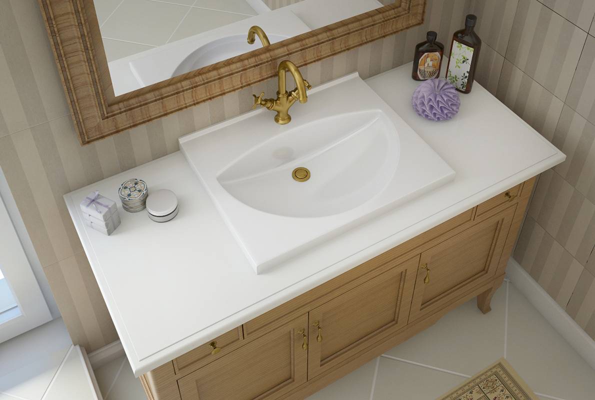 - Монтаж потолка. В столешнице делается небольшое отверстие для установки раковины, но меньше размера раковины. Получается, что раковина просто лежит сверху. Высота умывальника на столешнице не должна быть слишком высокой.