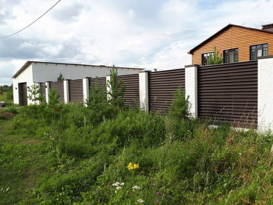 На фотографии выше образец уличного забора, где штакетник выложен горизонтально цельным полотном, а столбы выполнены из бетона.