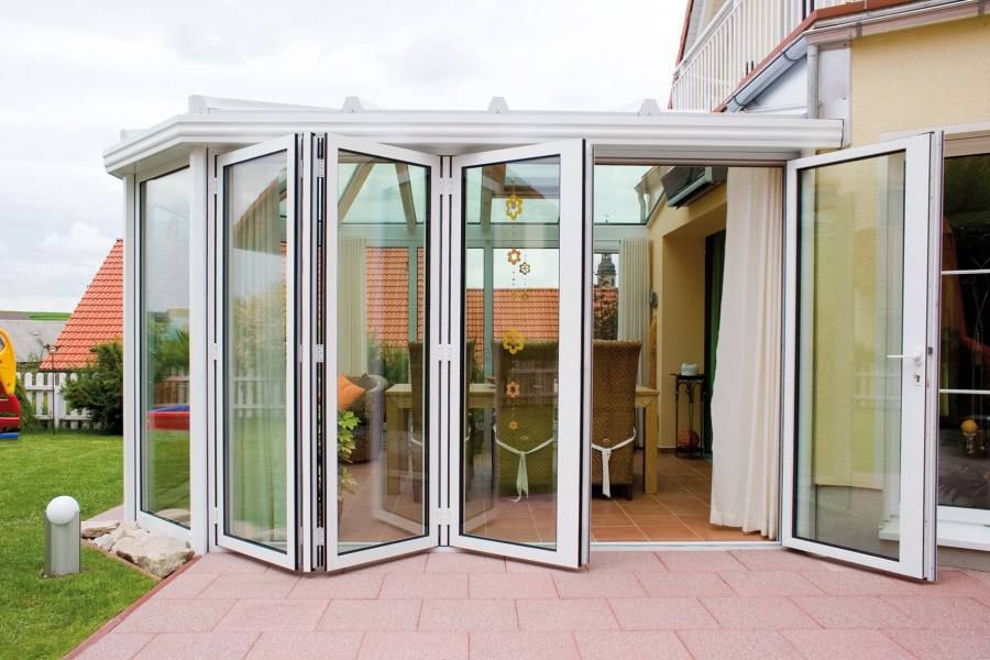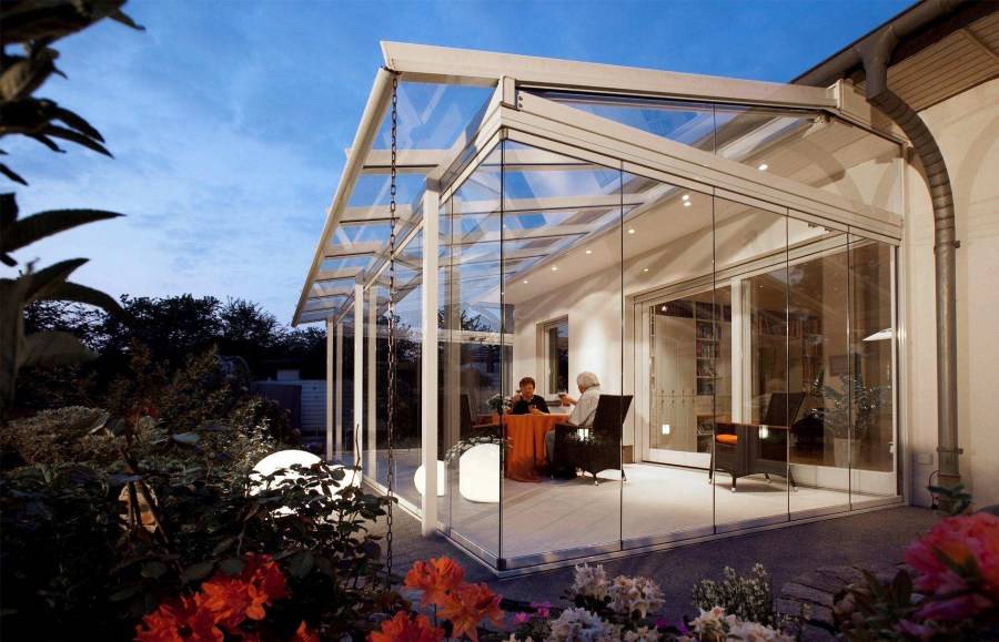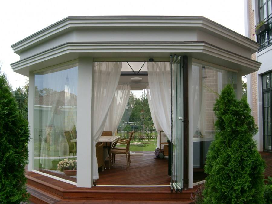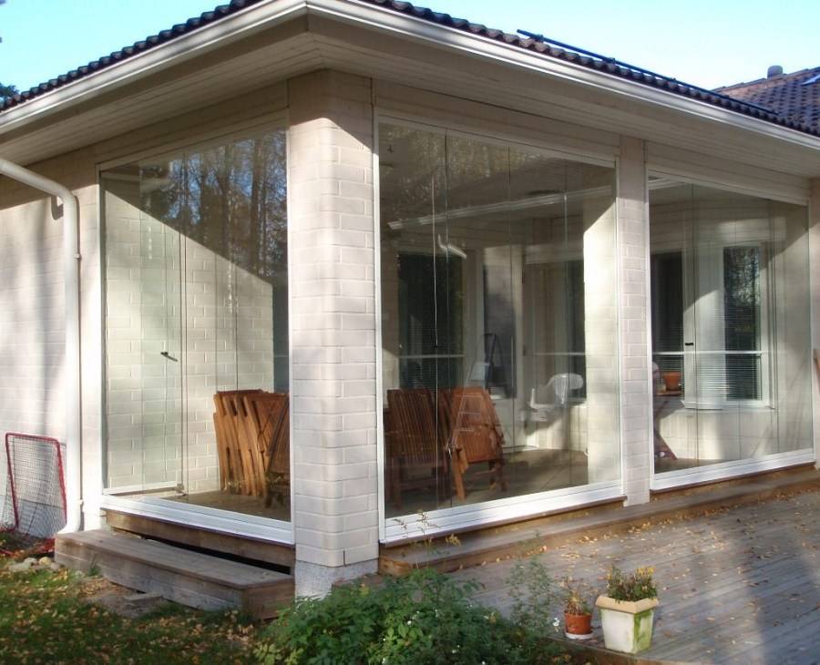 Современный вариант веранды – из готовых стеклопакетов. Конструкция выглядит легкой и невесомой, а использование передовых технологий, а именно раздвижные системы окон, позволяют трансформировать закрытую веранду в открытую летнюю террасу.