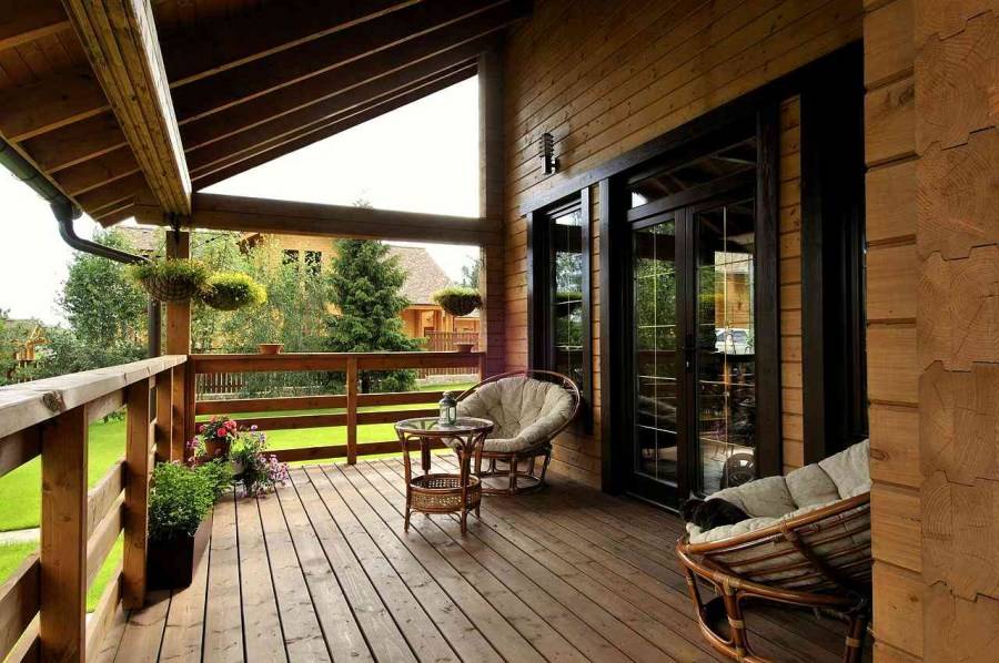 Внутренняя отделка в первую очередь зависит от того, открытая терраса или закрытая. Веранда открытого типа подвержена негативным факторам окружающей среды: ветер, дождь, мороз. В связи с этим отделочный материал должен быть устойчив и к разности температур и влагостоек.
