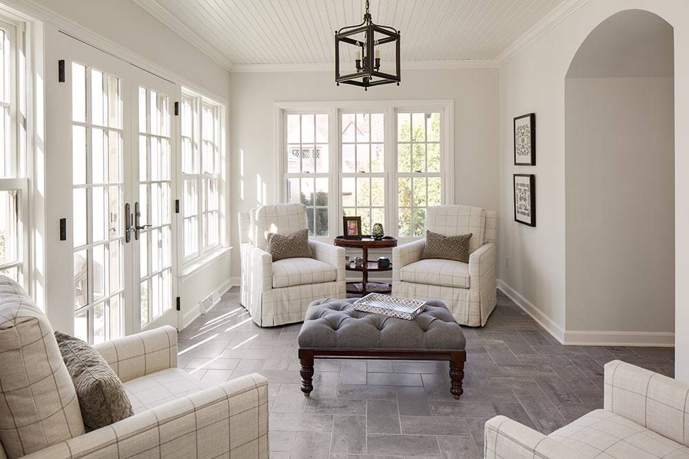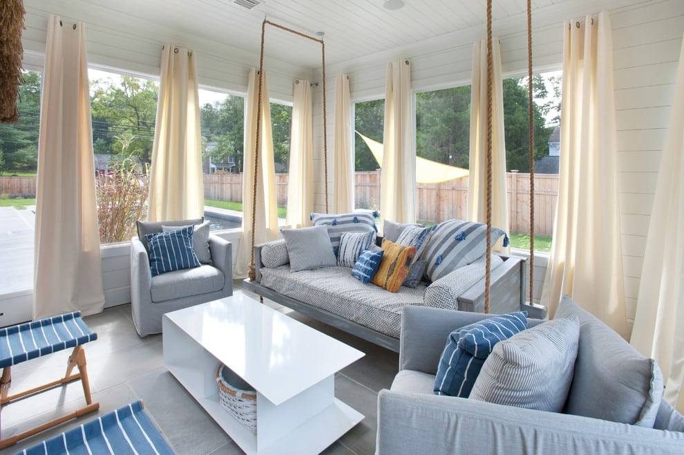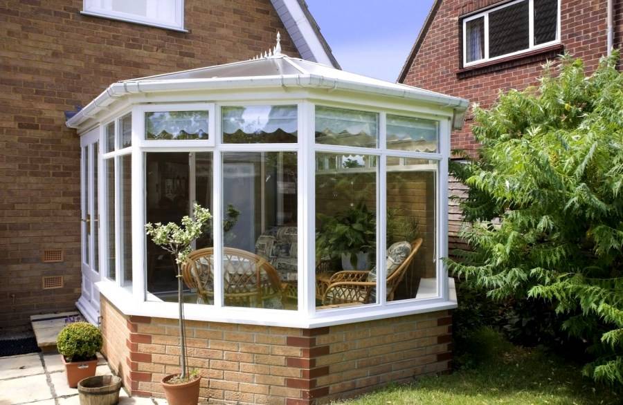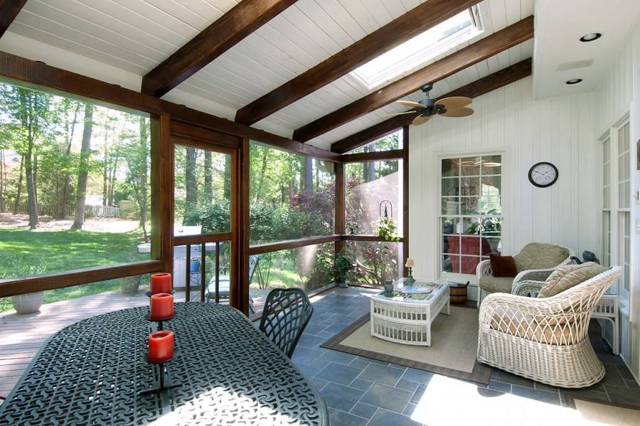 При отделке стен, предпочтение следует отдавать светлым тонам. Установка больших окон с трех сторон позволит добиться максимального естественного освещения, что придаст веранде пристроенной к дому еще больше визуального пространства.