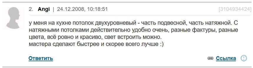А что же говорят в сети те, кто уже установил себе на кухню натяжные потолки? Чтоб мы ни говорили и как-бы не структурировали информацию, но живой отзыв с форума звучит всегда убедительней.