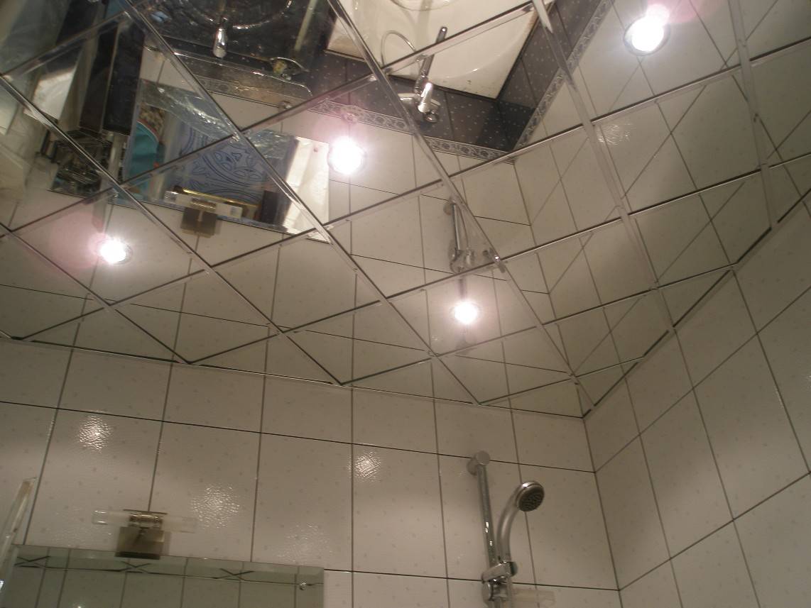 - Зеркальные плиты, которые крепятся на реечный каркас. Опорные конструкции изготавливаются из алюминия. В результате получается ячеистая структура потолка, с высокими характеристиками отражающей поверхности. Такой потолок, действительно, отразит в своей поверхности все, включая мельчайшие детали обстановки. Эффект от использования зеркальных плит может быть просто потрясающий, тем более, что для изготовления потолков могут использовать плиты разных цветов, которые легко комбинировать. Интересно выглядят зеркальные поверхности со скошенными гранями, которые создают эффект радуги, транслируя его на обстановку ванной комнаты. Можно выбрать ячейки с рисунком, гравировкой и другими дополнениями. К плюсам такого покрытия относится оригинальный, и даже роскошный внешний вид, высокие характеристики прочности, устойчивости к воздействию влаги и пара. К минусам можно отнести высокую стоимость и требовательность такого вида оформления. Для того, чтобы такой потолок хорошо смотрелся, окружающий его интерьер должен быть безупречен. Обтерханные стены или обшарпанная ванная, отразившись в потолочном зеркале, не добавит красоты и хорошего настроения.