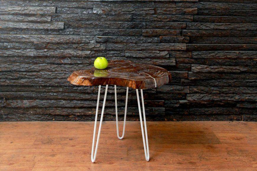 - Из пня или участка ствола дерева. Для создания такого «произведения искусства» не потребуется практически ничего, кроме деревянной заготовки и стеклянной столешницы. В качестве альтернативы стеклу можно использовать ненужное зеркало.